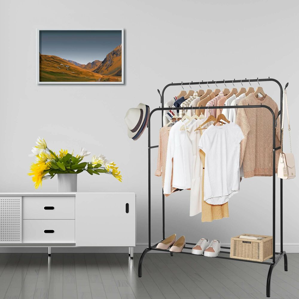 Elegantný kovový vešiak s dvojitou tyčou a spodným botníkom ponúka dostatok miesta na oblečenie, bundy aj doplnky. Stabilná konštrukcia unesie až 20 kg, matná čierna farba dodá moderný vzhľad. Esteticky zakončené úchyty chránia tkaniny a pôsobia elegantne. Ideálne do predsiene, chodby aj spálne. Rozmery 110x55x146 cm (šxhxv).
