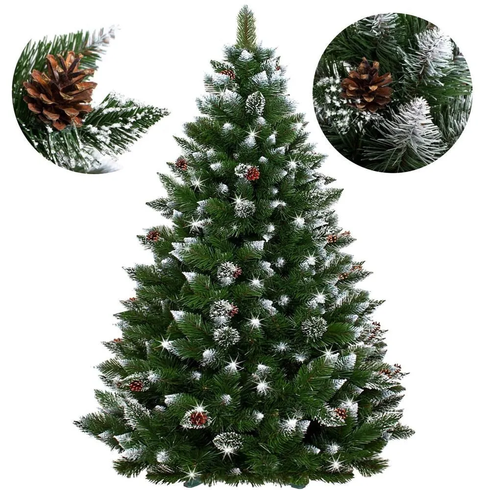 Umelý vianočný stromček s realistickým vzhľadom zasneženej borovice. Srienisté konce vetvičiek, efekt námrazy, prekrásne zdobené pravými šiškami, rovnomerne rozložené ihličie, husté vetvenie bez medzier. Výška stromčeka 250 cm, spodná šírka 110 cm, priemer stojana 90 cm.