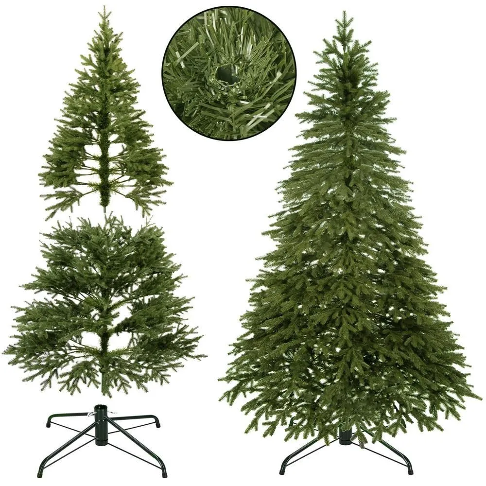 Prémiový vianočný stromček s dokonale autentickým vzhľadom alpského smreka. Vysoko kvalitný a realistický 100% PE materiál, extra husté a nerovnomerné vetvenie bez medzier, detailné spracovanie vetvičiek, elegantný kovový stojan, prírodná zelená farba, spodná šírka 140 cm. stojana 55 cm.