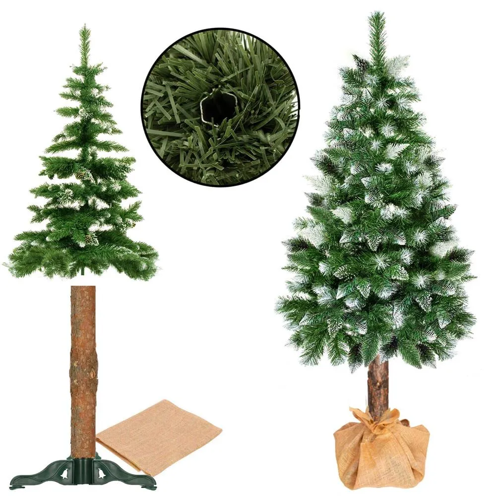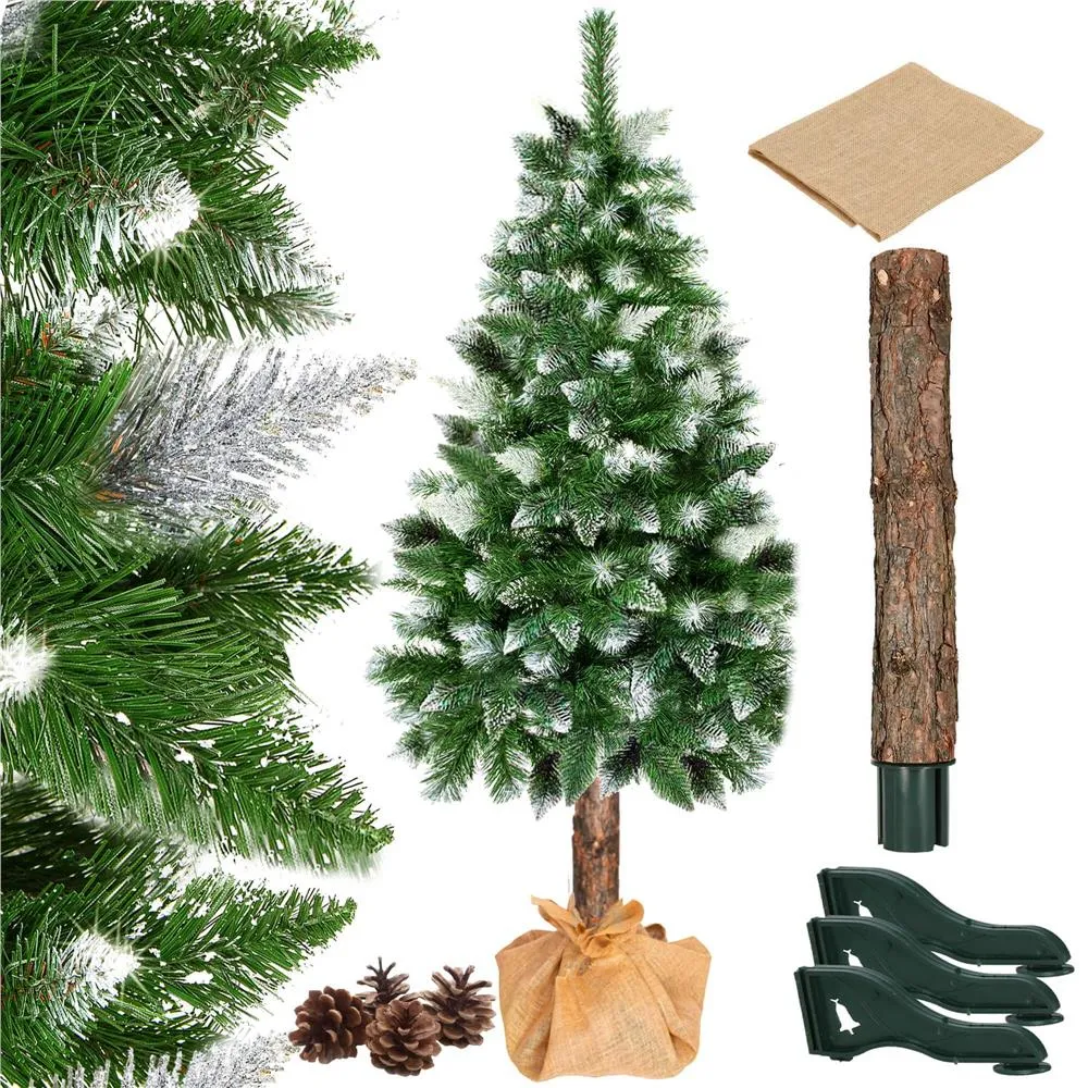 Umelý vianočný stromček s prírodným kmeňom a stojanom obaleným pravou jutou. Zasnežené konce vetvičiek, efekt námrazy, prekrásne zdobené pravými šiškami. Prírodná vôňa dreva, rovnomerne rozložené ihličie, detailne spracované vetvičky, husté vetvenie bez medzier, prírodná zelená farba. Výška stromčeka 180 cm, spodná šírka 77 cm, priemer stojana 45 cm.