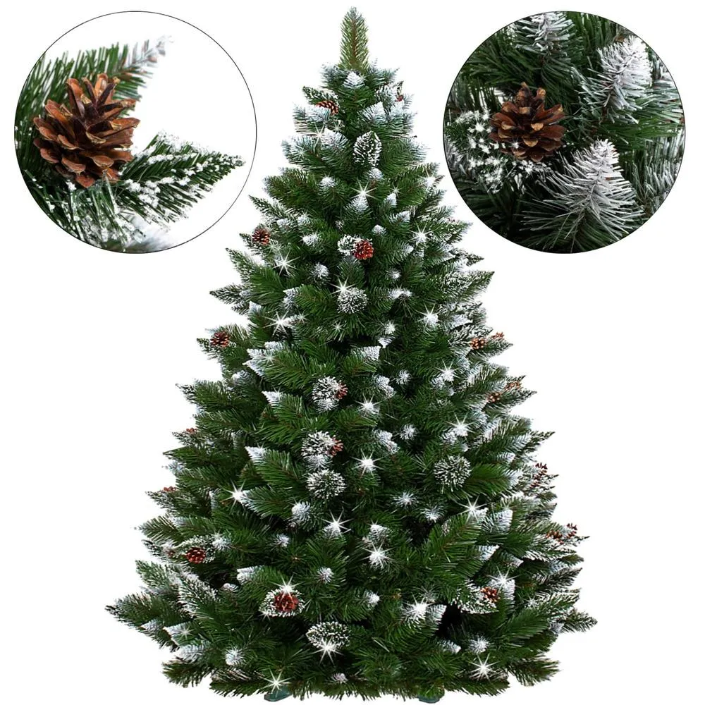 Umelý vianočný stromček s realistickým vzhľadom zasneženej borovice. Srienisté konce vetvičiek, efekt námrazy, prekrásne zdobené pravými šiškami, rovnomerne rozložené ihličie, husté vetvenie bez medzier. Výška stromčeka 120 cm, spodná šírka 80 cm, priemer stojana 60 cm.