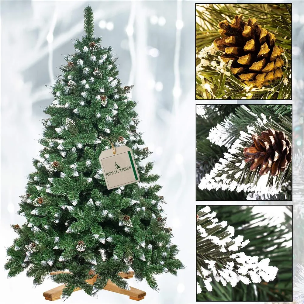 Prémiový vianočný stromček s dokonale autentickým vzhľadom jemne zasneženej borovice. Stromček je prekrásne zdobený pravými šiškami a vetvičkami s jemne zasneženými a namrznutými koncami. Živá zelená farba a silné, husté vetvičky s rovnomerne rozloženým ihličím dodávajú stromčeku bohatý a prirodzený vzhľad. Vďaka zosilnenej konštrukcii a štýlovému drevenému stojanu je stromček veľmi stabilný a unesie aj bohaté zdobenie. Okolo stromčeka je dostatok voľného miesta na vianočné darčeky, čo prispeje k vytvoreniu krásnej sviatočnej atmosféry. Pre pohodlné zostavenie stromčeka nájdete v balení aj rukavice a krém na ruky. Výška 180 cm, šírka 120 cm, priemer stojana 49 cm. Prémiové materiály, kombinácia PE+PVC pre prirodzený vzhľad.