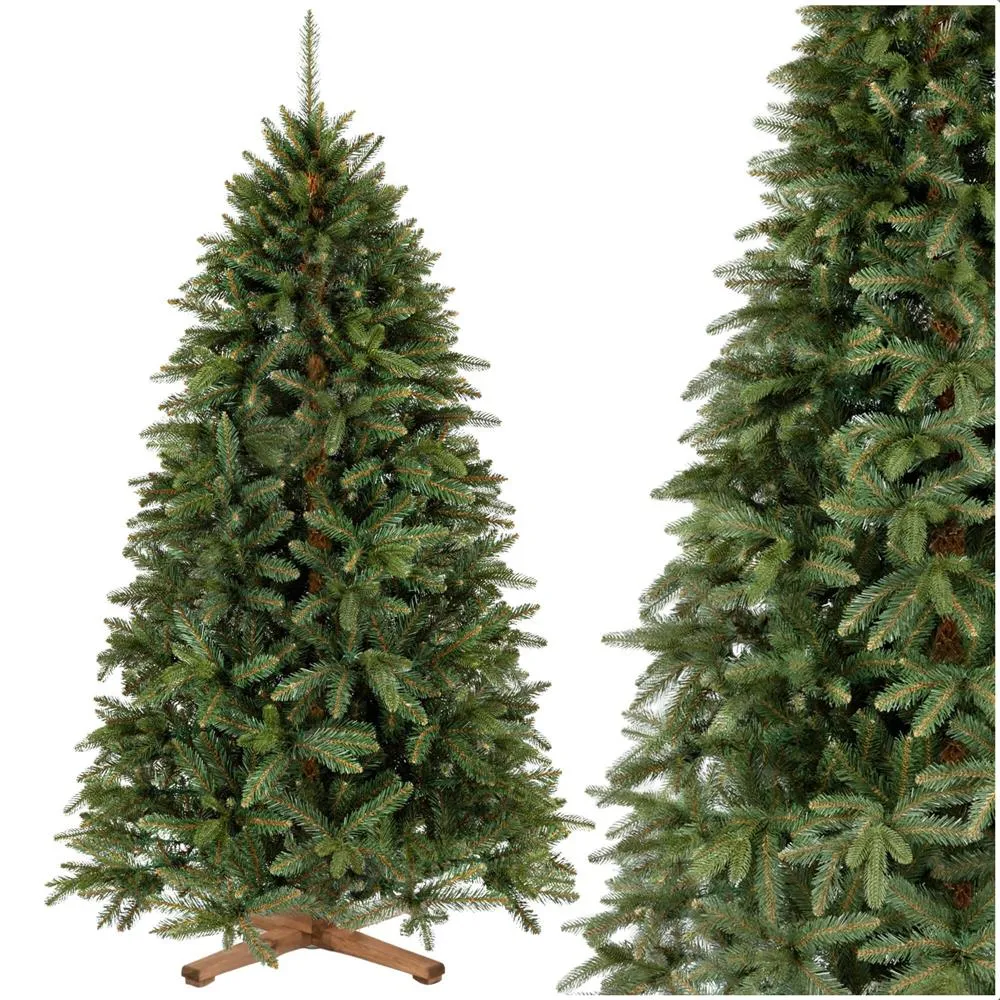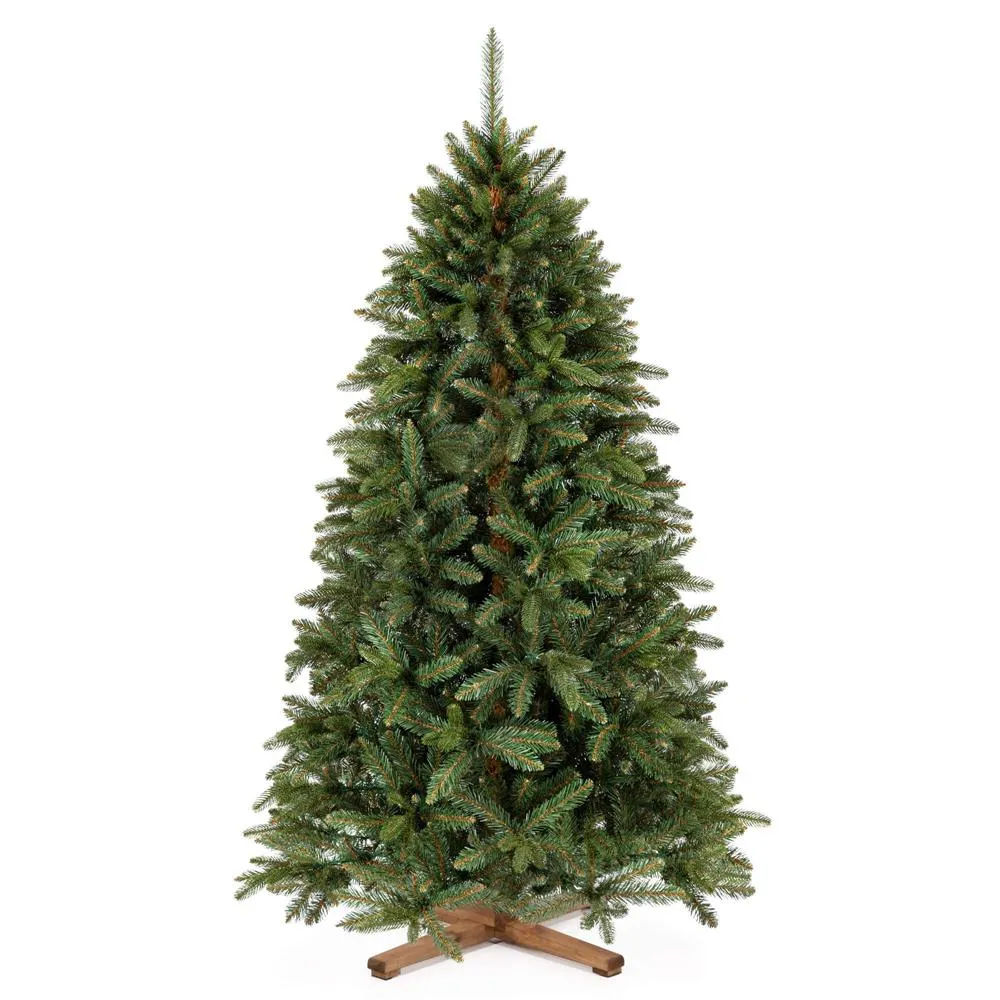 Kombinácia dvojfarebného PE a PVC ihličia s dvojitým typom ihličia dodáva konárom bohatý a autentický vzhľad. Vďaka možnosti modelovania vetiev je možné stromček ľahko upraviť do dokonalého tvaru presne podľa vašich predstáv. Kvalitný zosilnený rám poskytuje stromčeku výbornú stabilitu a dlhú životnosť, zatiaľ čo prírodný vzhľad dotvára masívny drevený stojan , ktorý krásne ladí k vianočnému interiéru.