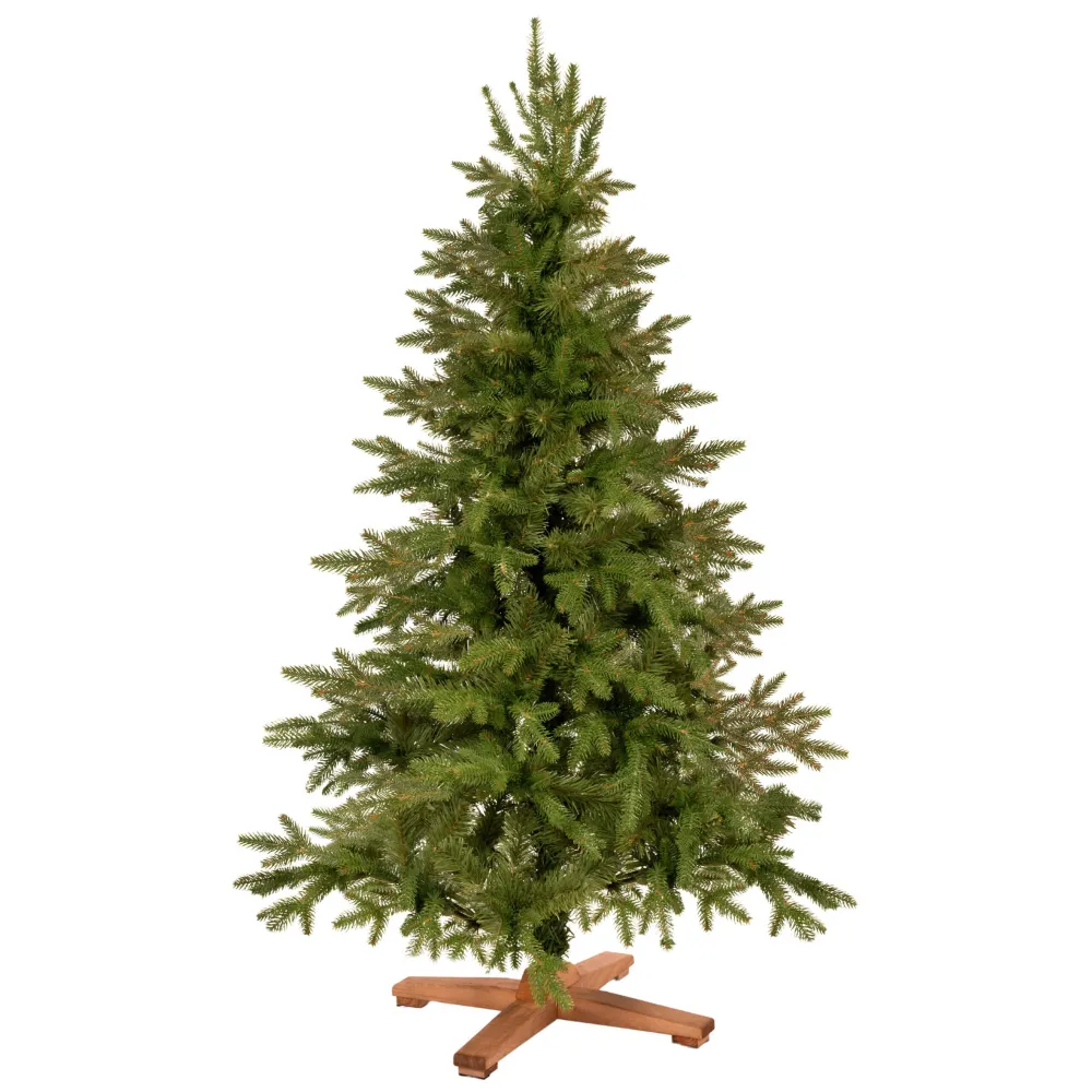 Na dosiahnutie maximálne verného efektu je použitá kombinácia silnejšieho dvojfarebného PE a PVC ihličia , ktorá vytvára prirodzenú štruktúru i sfarbenie. Vďaka možnosti modelovania vetiev je možné tvar stromčeka ľahko upraviť podľa vašich predstáv – od rovnomerne symetrického až po prirodzene rozvoľnený. Kvalitný zosilnený rám zaisťuje vynikajúcu stabilitu a dlhú životnosť, zatiaľ čo masívny drevený stojan dodáva stromčeku prírodný vzhľad a nadčasový štýl.