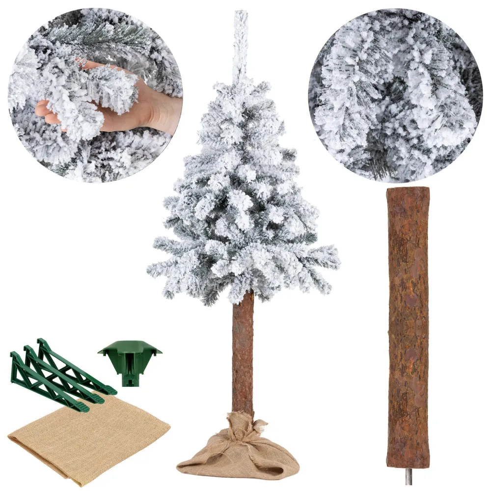 Umelý vianočný stromček so zasneženým ihličím a prírodným kmienkom z pravého dreva pôsobí ako čerstvo prinesený z lesa. Vďaka ultra realistickému vzhľadu a vysokej hustote vetiev vytvára dokonalú zimnú atmosféru. Ihličie z PVC fólie je rovnomerne rozložené a umožňuje modelovanie vetiev. Stromček dopĺňa jutový stojan, má odolnú konštrukciu, ľahko sa zostavuje a je šetrný k životnému prostrediu. Výška 160 cm, spodná šírka 72 cm, priemer stojana 45 cm.