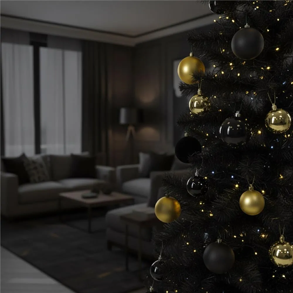 - Elegantné čierne prevedenie pre moderný vianočný dekor