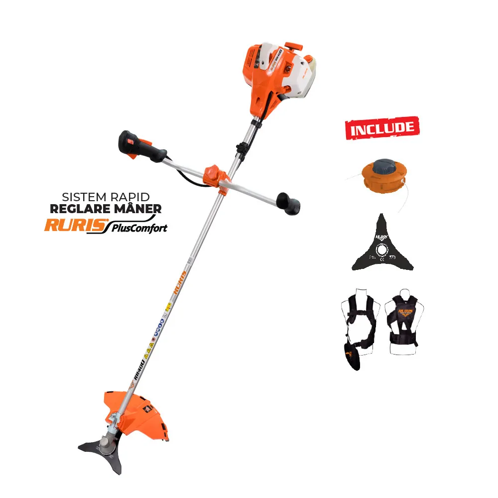 Krovinorez s vysokým výkonom, jedinečnou ergonómiou a vynikajúcou odolnosťou. Na kosenie trávnika, buriny, hustej a odolnej trávy, náletových drevín, kríkov, živých plotov. Ergonomický popruh s bedrovou opierkou, popruhmi a pásom pre lepšie rozloženie hmotnosti. Rýchlonastaviteľná konzola rukoväte RURIS PlusComfort, ktorá znižuje námahu pri pohybe zľava doprava počas kosenia o viac ako 50% v porovnaní s klasickým krovinorezom. Dlhé žacie lanko uľahčuje a zrýchľuje proces odstraňovania trávy. Palivová nádrž umožňuje kontrolovať a sledovať hladinu paliva. Možno použiť rezné kotúče s 2 – 80 zubovými nožmi . Ergonomický dizajn , šikmá a pohodlná rukoväť ponúka vynikajúce uchopenie a dobrú pracovnú polohu. Ľahký štart na rýchle štartovanie s minimálnou námahou. Jednoduchá údržba , rezné kotúče je možné rýchlo a bezpečne vymeniť.