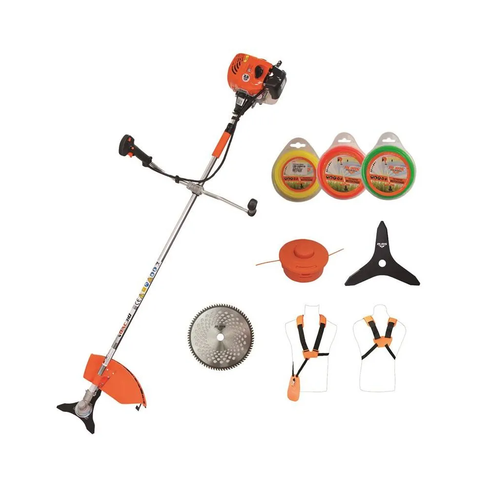 Krovinorez sa vyznačuje širokým záberom čepele 25 mm a struny 21 cm . Veľkou výhodou je tiež široké príslušenstvo , ktoré nájdete v balení. Mimo krovinorez spoločne s dvojramenným popruhom v balení nájdete aj žaciu hlavu , 3zubý žací nôž , 80zubý žací tanier a trojicu strún s rôznym priemerom a tvarom (každá struna s dĺžkou 15 metrov). Na zadnej strane sa nachádza plastový kryt .