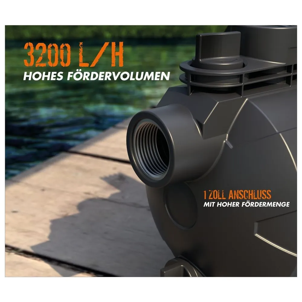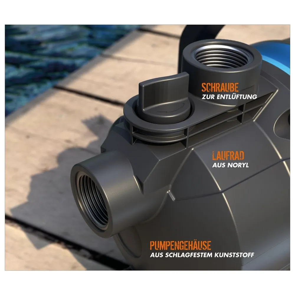 Kryt čerpadla vyrobený z plastu odolného voči nárazom, mechanické tesnenie, odvzdušňovaciu skrutku a skrutku na vypúšťanie vody. Obežné koleso z norylu, ergonomická rukoväť na prenášanie. Zapínač/vypínač, tepelná ochrana, kovové závitové vložky. Záhradné čerpadlo na zavlažovanie záhrady, na prevádzku maximálne jedného postrekovača, alebo na vyprázdňovanie jazierok/bazénov.