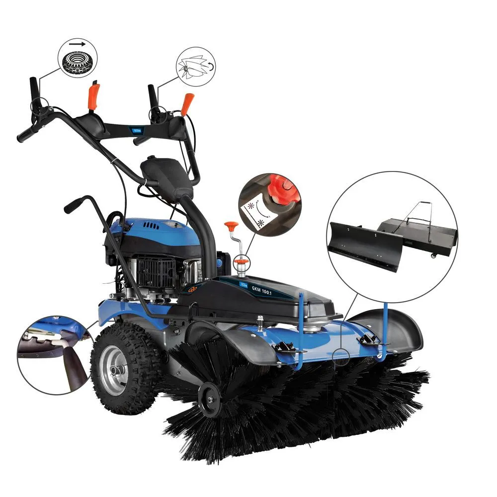 Zametací stroj GKM 100.1 je všestranne použiteľný a ideálny pre najrôznejšie práce. Poradí si s ľadom, snehom, lístím aj každodennými nečistotami. Dá sa jednoducho prestaviť iba v niekoľkých krokoch. Stroj je vybavený veľkou zbernou nádobou s kapacitou 72 litrov, a tak zaisťuje dlhé pracovné intervaly bez častého vyprázdňovania. Nízka hlučnosť v kombinácii s vyšším krútiacim momentom a zníženými vibráciami výrazne zvyšuje komfort pri práci. Súčasťou balenia je okrem motorovej metly aj odhrňovač snehu a zberná nádoba. Výškovo a smerovo nastaviteľná zametacia kefa, ako aj štartovacie lanko s funkciou jednoduchého štartu zaisťujú nekomplikovanú obsluhu. Nezávisle nastaviteľné otáčky kefy. Nastaviteľná rukoväť a rozsiahle možnosti prevodových stupňov poskytujú flexibilitu v rôznych pracovných podmienkach. Tento zametací stroj je možné optimálne prispôsobiť príslušnému zámeru čistenia vďaka nezávislému nastaveniu rýchlosti kefy. Ďalšou výhodou je, že sa dodáva čiastočne zmontovaný, takže uvedenie do prevádzky prebieha hladko as úsporou času.