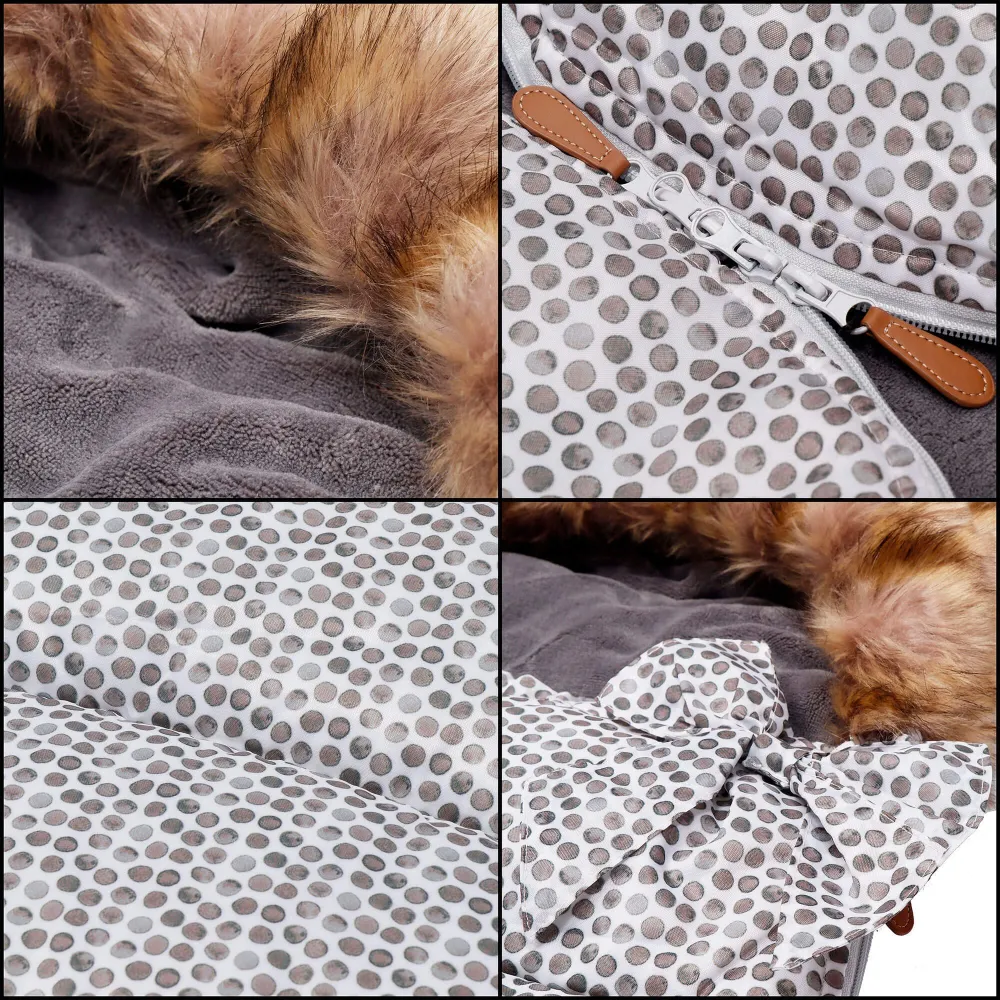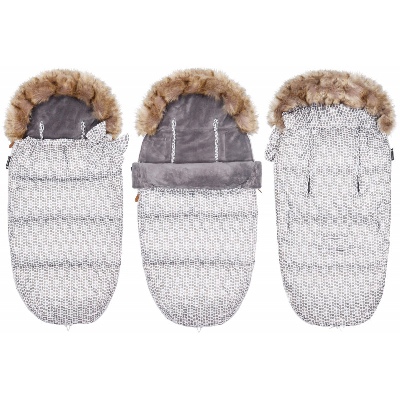 Vnútorná strana spacieho vaku je upravená mäkkým materiálom pre maximálne pohodlie dieťaťa. Výhodou spacieho vaku je kapucňa s kožúškom , ktorá ochráni naše dieťa pred mrazivým vetrom a snehom. Vonkajšia látka spacáku je vodeodolná , vďaka čomu výrobok počas používania nepremokne. Otvory na upevnenie pásov nám umožnia pohodlie pri jazde upútaní v kočíku . Umožní dokonalé prispôsobenie spacieho vaku všetkým druhom vybavenia. Jednoduchým a rýchlym spôsobom môžete pásy prevliecť montážnymi otvormi bez toho, aby ste museli rozopínať jednu stranu pásu.