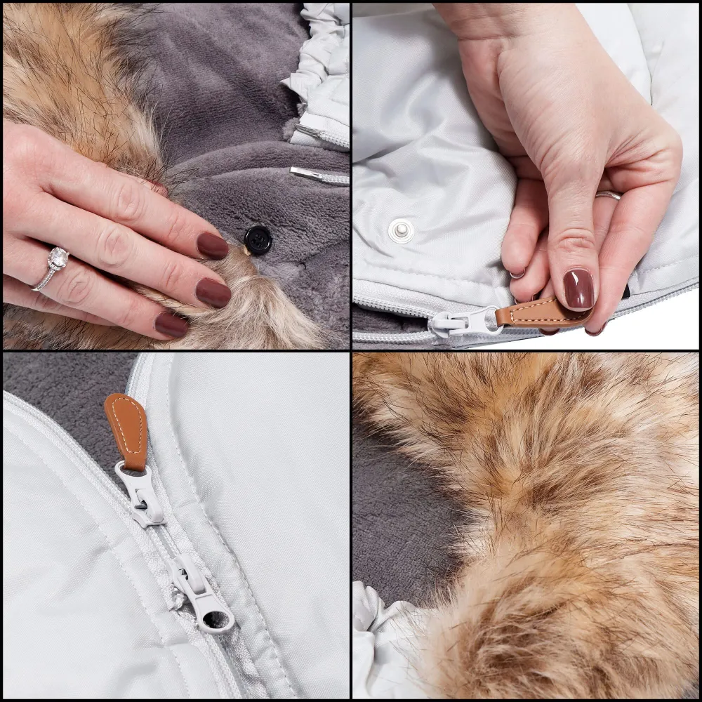 Vnútorná strana spacieho vaku je upravená mäkkým materiálom pre maximálne pohodlie dieťaťa. Výhodou spacieho vaku je kapucňa s kožúškom , ktorá ochráni naše dieťa pred mrazivým vetrom a snehom. Vonkajšia látka spacáku je vodeodolná , vďaka čomu výrobok počas používania nepremokne. Otvory na upevnenie pásov nám umožnia pohodlie pri jazde upútaní v kočíku . Umožní dokonalé prispôsobenie spacieho vaku všetkým druhom vybavenia. Jednoduchým a rýchlym spôsobom môžete pásy prevliecť montážnymi otvormi bez toho, aby ste museli rozopínať jednu stranu pásu.