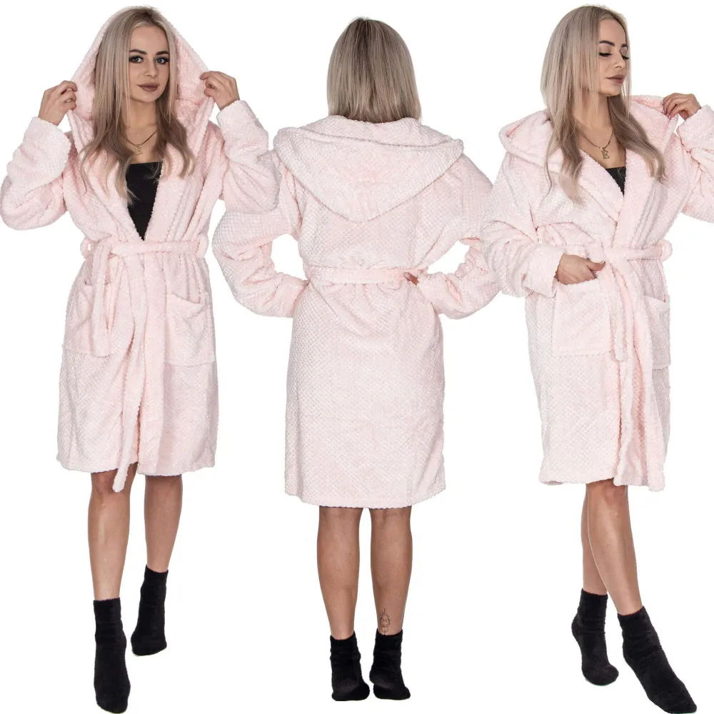 Dlhý strih poskytuje dostatok tepla a ochrany, zatiaľ čo moderný dizajn v elegantnej svetlo ružovej farbe as bohato textúrovaným vzorom dodáva na atraktivite. Župan je perfektne navrhnutý tak, aby spĺňal nároky na komfort a funkčnosť v každodennom používaní.