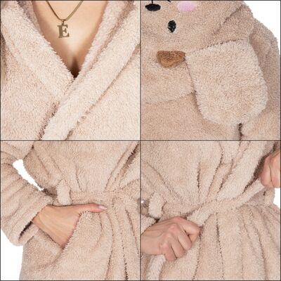 Dlhý strih poskytuje dostatok tepla a ochrany, zatiaľ čo moderný dizajn s motívom škrečka s uškami dodáva na atraktivite. Župan je perfektne navrhnutý tak, aby spĺňal nároky na komfort a funkčnosť v každodennom používaní.